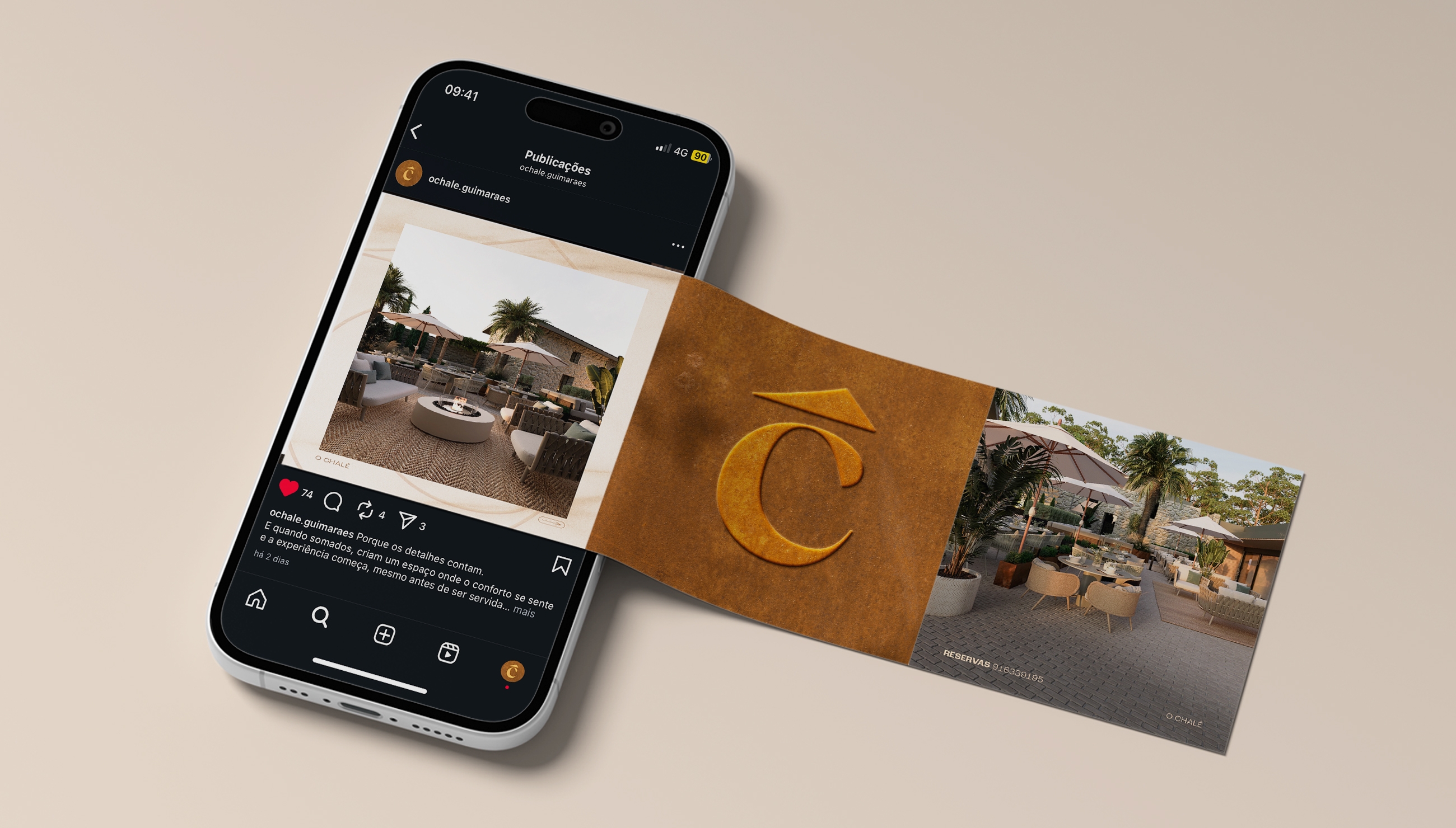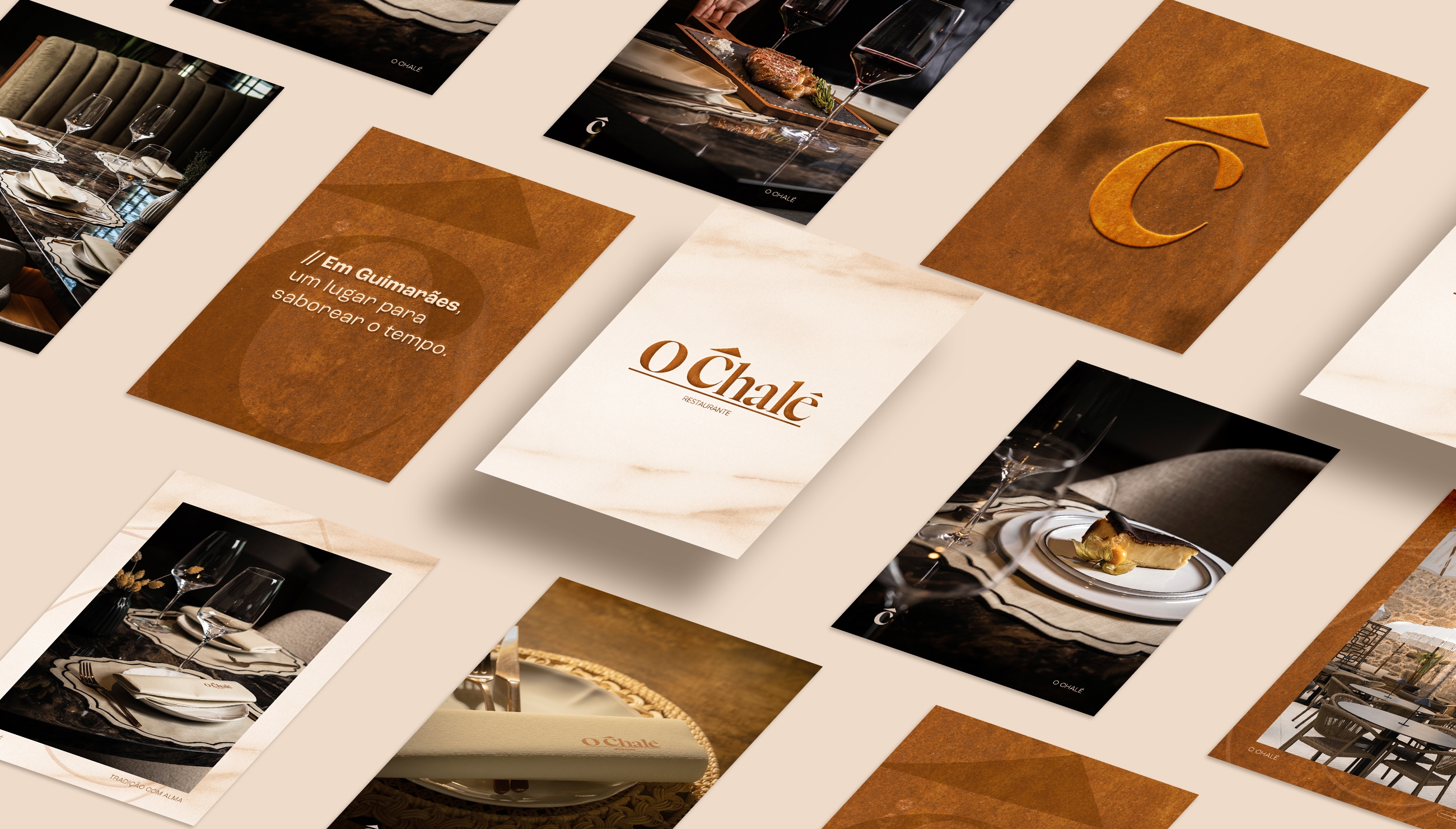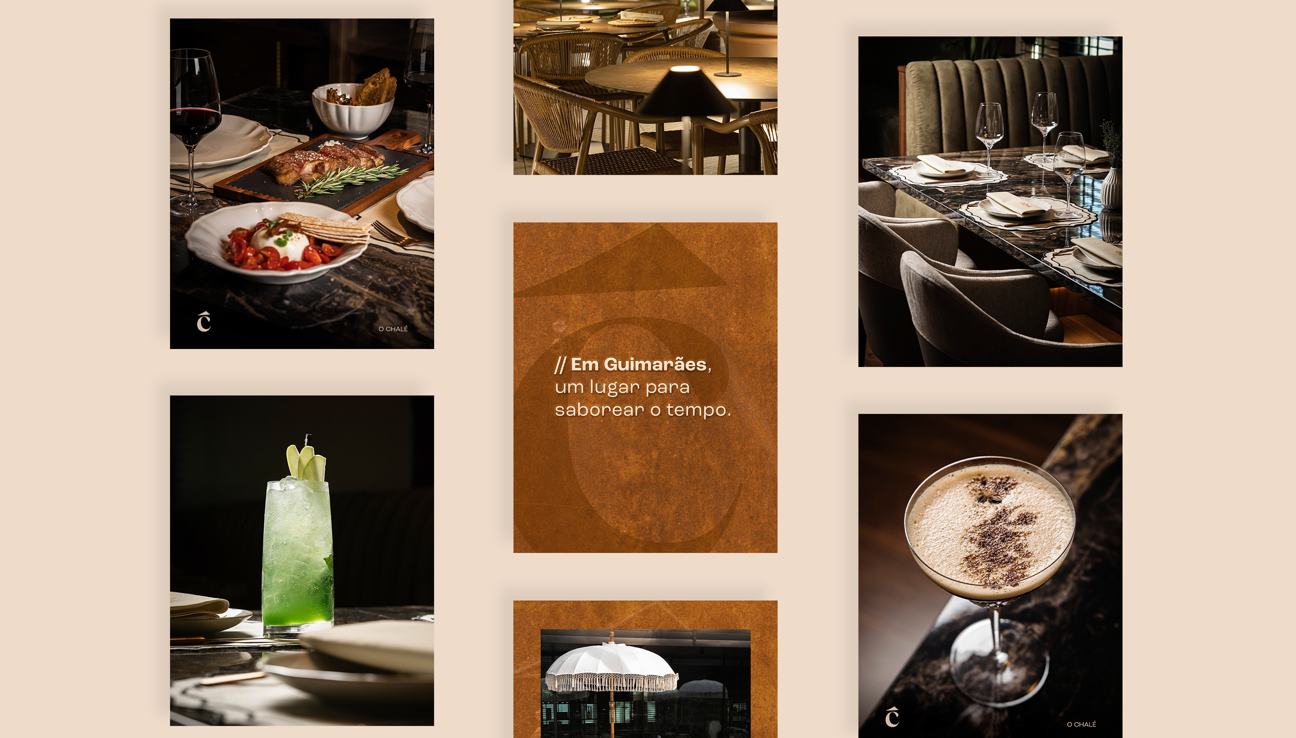 Partimos das texturas e do carácter do espaço para desenvolver a linguagem das redes sociais. A pedra, a madeira e os tons neutros inspiraram uma estética quente e sensorial, pensada para transportar o público para dentro da atmosfera do restaurante. Criámos um tom sereno e elegante, revelando o ambiente, os detalhes e a autenticidade que definem o posicionamento do Chalé.